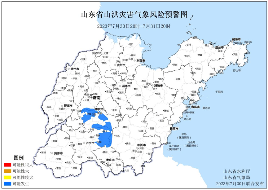 预计7月30日20时至7月31日20时,济南、泰安、济宁、临沂、枣庄等市局部地区可能发生山洪灾害(蓝色预警)。