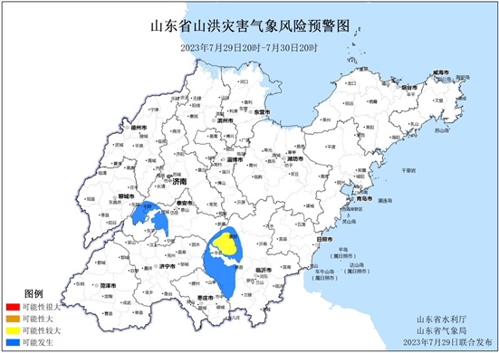 预计7月29日20时至7月30日20时,临沂市局部地区发生山洪灾害的可能性较大(黄色预警),济南、泰安、临沂、枣庄、济宁等市局部地区可能发生山洪灾害(蓝色预警)。