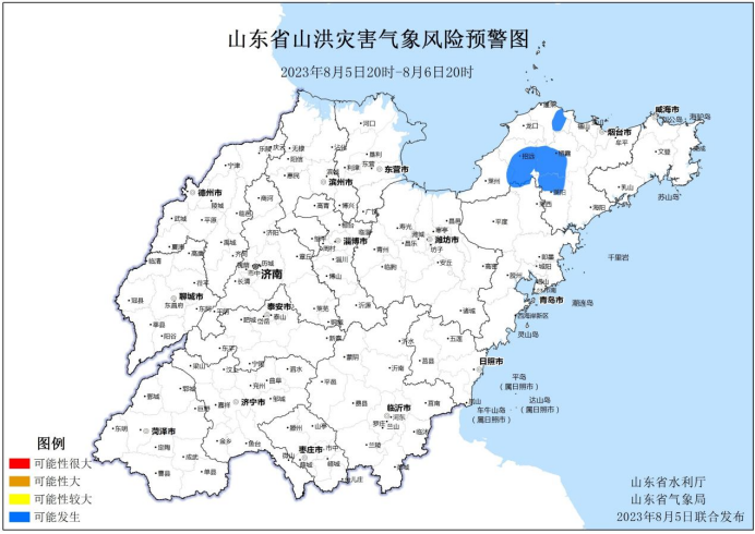 预计8月5日20时至8月6日20时,青岛、烟台等市局部地区可能发生山洪灾害(蓝色预警)。